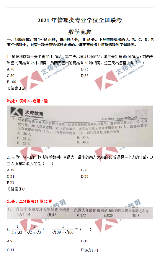 2021年MBA管理类联考数学真题命中对照 点击咨询>>