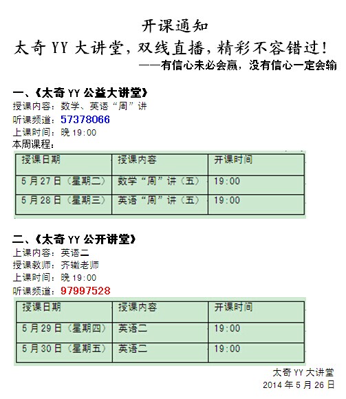 从本周一(5月26日)开始,每日一“恋”各科不再发放详解,相关题目解析每周在太奇YY大讲堂由老师进行统一讲解,每周课程在太奇YY大讲堂万人备考群进行公布,YY群号:9444754  YY听课频道:57378066