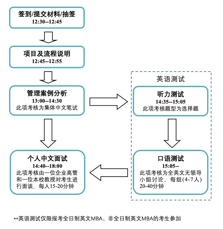 上外MBA预复试由管理案例分析、个人中文面试、英语测试(仅限报考全日制英文MBA、非全日制英文MBA的考生参加)三个环节构成。具体流程安排如下: