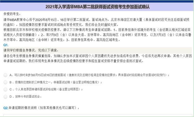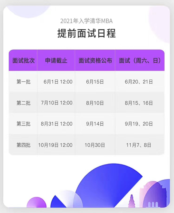 2021年清华MBA的日程安排(材料截止及面试时间)和往年相比差别不大,但第一批面试6月份的时候北京疫情形势不太乐观,所以面试时间都延后了,故第一批材料通过,需要面试的同学们都被迫在第二批面试时候选择第二或者后三四批次来面试。