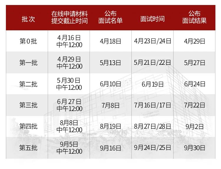 考生在线完整填写申请表并上传申请资料,信息确认无误后在线提交。提交申请材料时需选择申请项目与面试批次,每位考生当年仅有一次申请机会,不可以同时申请不同项目或不同批次。