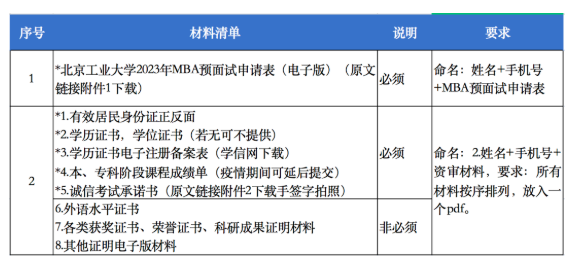 1.《北京工业大学2023年工商管理专业硕士MBA预面试申请表》(见原文链接附件1,提取码:7jeb)。《北京工业大学2023年硕士研究生招生考试诚信考试承诺书》(见原文链接附件2,提取码:7jeb)承诺书需要打印后亲笔签字后拍照。