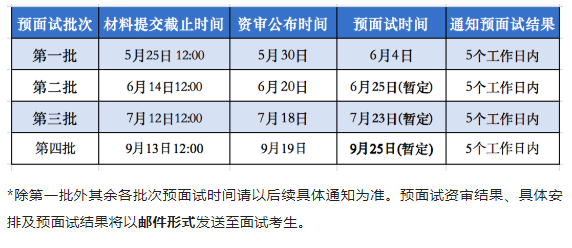 *除第一批外其余各批次预面试时间请以后续具体通知为准。预面试资审结果、具体安排及预面试结果将以邮件形式发送至面试考生。