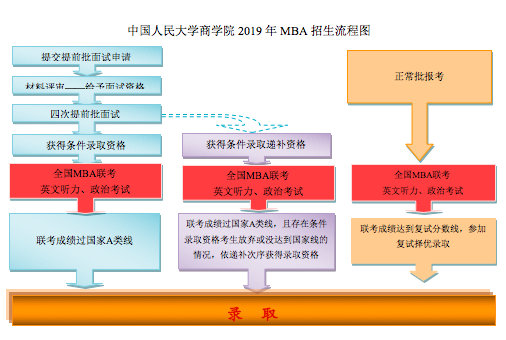 登录中国人民大学商学院MBA项目中心网站“考生服务系统”,按照规定时间提交网上申请材料,学院将组织专家评审申请材料,择优给予提前面试资格并组织面试。面试后获得条件录取资格和条件录取递补资格的考生需参加2018年12月底举行的全国联考。