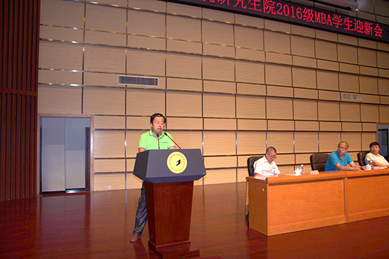 首先,我院院长黄晓勇教授为迎新会致辞。黄院长代表中国社会科学院研究生院全体教职员工向2016级MBA学生表示热烈的欢迎和诚挚的祝贺,同时向工作奋斗在教学科研第一线的老师们致以崇高敬意和节日的祝贺。他强调,中央给中国社会科学院的三大定位是:马克思主义的坚强阵地、中国哲学人文社会科学的最高学术殿堂、党中央和国务院的思想库、智囊团。黄院长还介绍了中国社会科学院研究生院的历史沿革和优良传统,展示了我院顺应时代发展要求和具有深厚根基的院校风采。“时代呼唤优秀的工商管理人才辈出”,黄院长结合当前经济形势和发展格局,鼓励大家铭记八字校训,准确把握社会变革的动向,积极进取、勇敢创新,在这个充满活力和机会的社会中,抓住健康的、可持续发展的历史发展机遇,将中华民族伟大复兴之梦与个人理想实现之梦紧密结合,成为中国社会主义现代化事业未来发展和中国在世界上发挥领导地位和作用的人才。