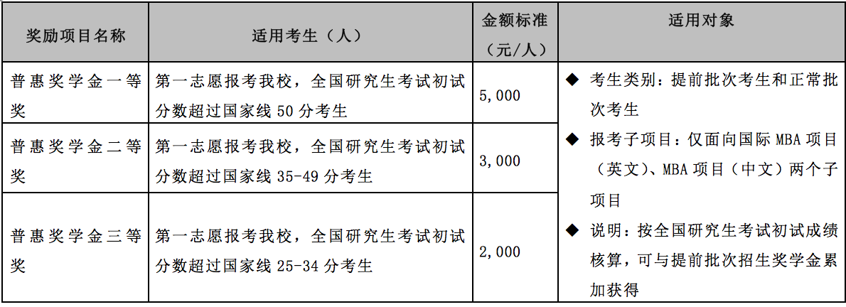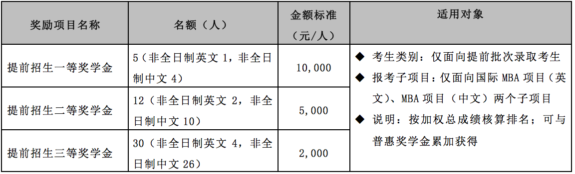 设立四种类别入学奖学金,以资鼓励报考我校MBA/EMBA项目、全国研究生考试初试分数成绩优秀、提前批次招生面试表现出色的考生。
