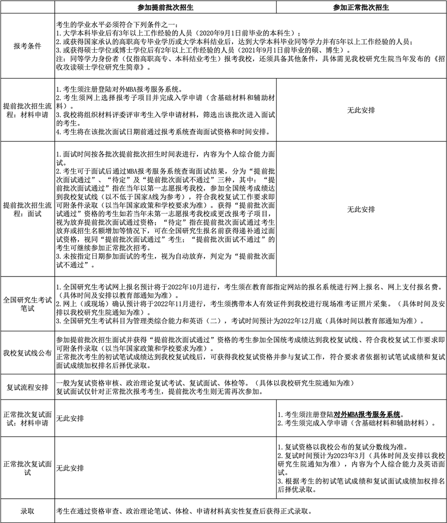 4.“MBA提前批次招生”将安排于2022年6月至10月进行,参加提前批次招生的考生须在全国研究生考试报名前的指定期间内在线提交申请材料,经过材料评审,择优给予面试资格;经过面试环节择优给予综合素质优秀的考生“提前批次面试通过”资格;原则上,参加提前批次招生面试并获得“提前批次面试通过”资格的考生参加全国统考成绩达到我校复试线(以不低于国家A线为参考),符合我校复试工作要求即可附条件录取(以当年国家政策和学校要求为准)。获得“提前批次面试通过”资格的考生如若当年未第一志愿报考我校或更改报考子项目,视为放弃提前批次面试通过资格。