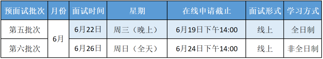 大家好!感谢您申请2023年入学华东师范大学MBA项目预面试。现阶段因处于疫情防控阶段,为方便考生,暂定全日制与非全日制预面试均采用线上形式(具体以邮件通知为准)。预面试第一、二、三、四批次已结束,6月15日(非全日制)批次因人数已满,报名通道已提前自动关闭。现已开启6月22日(全日制)和6月26日(非全日制)预面试报名通道(具体详见下图,我们会根据实际情况逐步开放后期批次),因每一批次名额有限,人满系统将提前自动关闭报名通道。预面试时间持续更新中,请随时关注官方微信公众号与官方网站。申请网址:http://mbazs.ecnu.edu.cn/