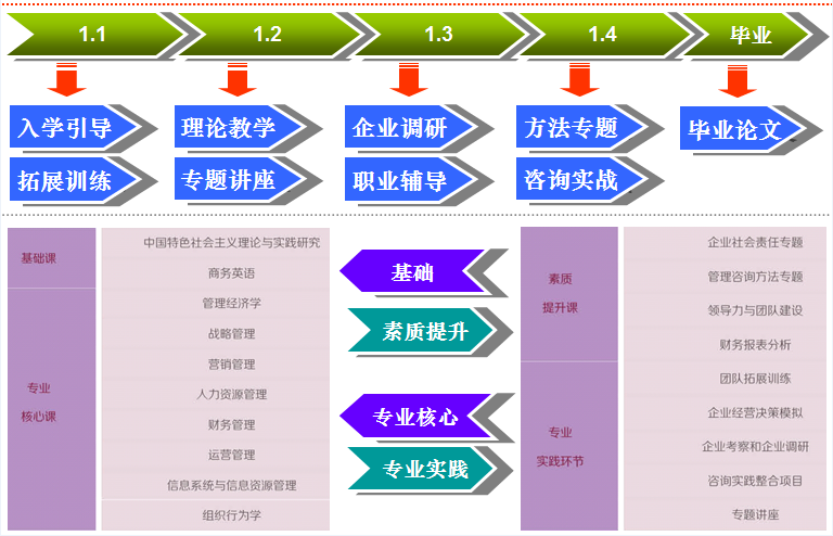 北方工业大学工商管理硕士(MBA)致力于培养注重方法与技能的应用型中高层管理人才。在培养过程中实行“通才教育 + 专长发展”的培养思路。切实帮助学员在两年的MBA学习中实现:思维范式转换、知识体系更新、方法技能娴熟、管理能力提升四个转变,最终提升综合管理胜任素质。