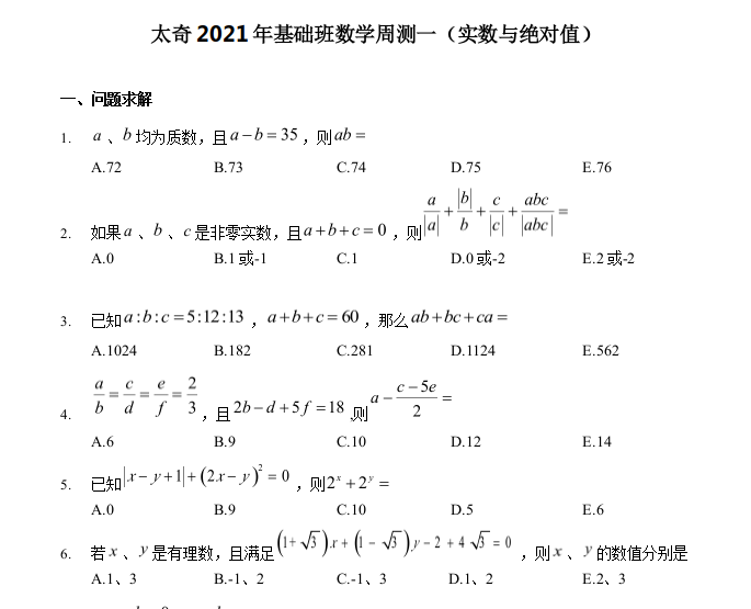 【数学】太奇MBA2021年基础班数学周测一
